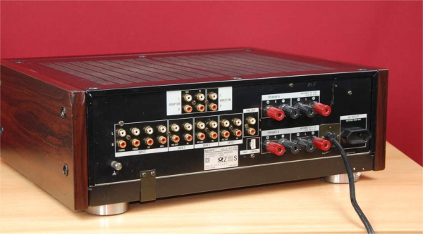 At the rear are 14 pairs of goldplated phono sockets for the various inputs and the three record outputs, four pairs of 4mm socket/binding posts for the loudspeaker outputs, a ground screw for the pickup arm earth, a special four-pin "Control S" socket which permits operation of an appropriately appointed Sony tuner from the RM-S703 remote control (which will additionally operate other Sony equipment such as a DAT recorder and CD player), and a switched two-pin IEC mains outlet. As supplied, shorting plugs are fitted to the phono input sockets and should be left in place if an LP front end is not required.